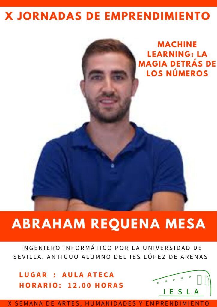 Dentro de la X Semana de las Artes, Humanidades y Emprendimiento, tendremos las X Jornadas de Emprendimiento donde los ponentes Abraham Requena y Daniel Maqueda, antiguos alumnos de nuestro Instituto, nos darán unas charlas y hablarán de «Machine learning» y «Como funciona un hospital», respectivamente. Las charlas tendrán lugar el viernes 26 de abril a partir de las 12h en el Aula Ateca del Centro.