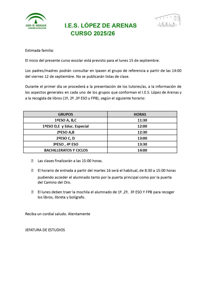 Desde el IES López de Arenas les damos la bienvenida al nuevo curso escolar 25/26. El lunes 15 de septiembre el alumnado entrará de forma escalonada, según el horario siguiente.