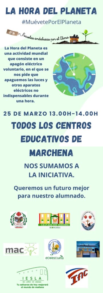 Los centros educativos de Marchena mostramos nuestro compromiso conjunto de apagar las luces, fotocopiadoras, ordenadores y pizarras digitales de los centros escolares de nuestra localidad durante el día 25 de marzo, de 13:00 a 14:00h.