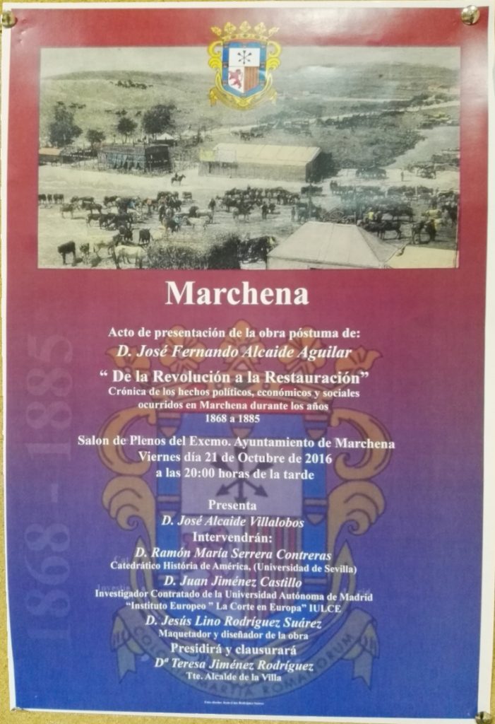 El pasado 21 de octubre tuvo lugar en el salón de plenos la presentación del libro póstumo de José Fernando Alcaide Aguilar «DE LA REVOLUCIÓN A LA RESTAURACIÓN», donde hace un repaso de los acontecimientos más importantes acaecidos en Marchena durante el período de 1868 al 1885.