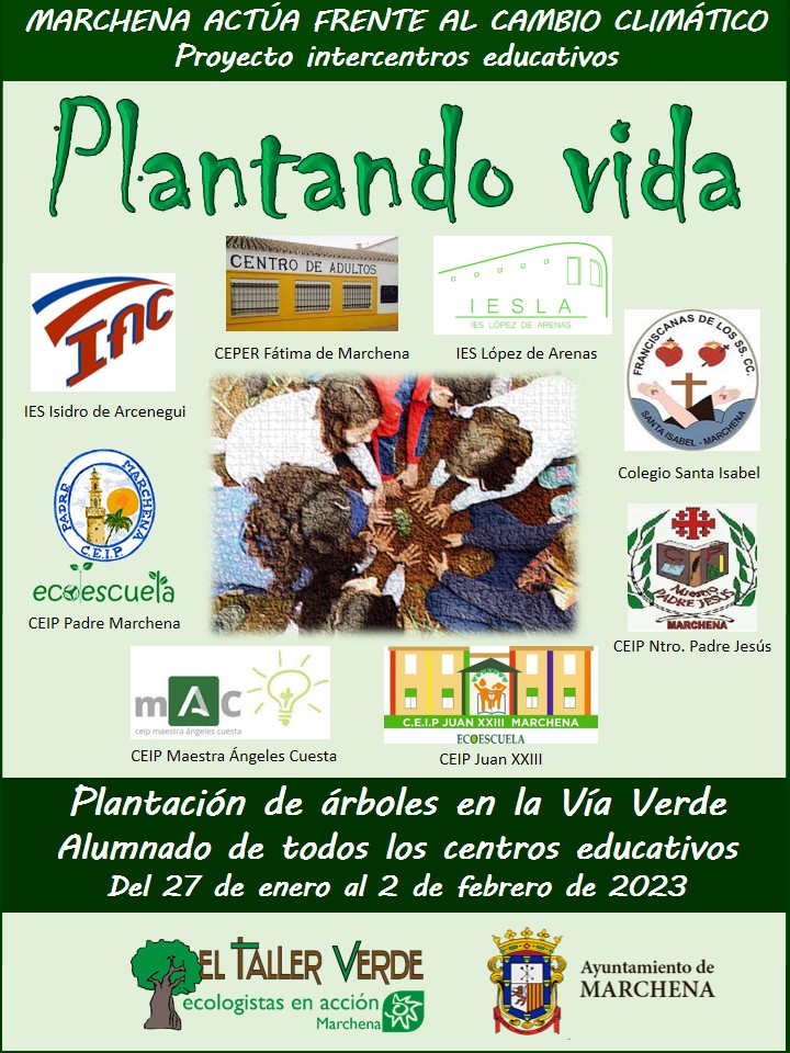 El siguiente cartel muestra la actividad que este año se va a llevar a cabo por primera vez. Un proyecto intercentros educativos para actuar frente al cambio climático, realizando una plantación de árboles en la Vía Verde junto con el Taller Verde y donde también ha colaborado el Ayuntamiento de Marchena. Dicha plantación se llevará a cabo por parte de nuestro centro, el próximo día 2 de febrero con el alumnado de 1ESO A, B y el Aula Específica.