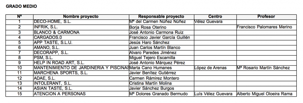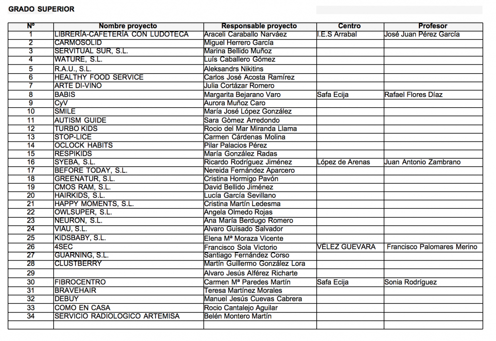 Se han inscrito 49 Proyectos de Empresas a la IX edición del Concurso JOVEMPRENDE, de los Institutos Velez de Guevara y Escuelas Profesionales (SAFA) de Écija , IES Arrabal de Carmona y IES López de Arenas de Marchena.