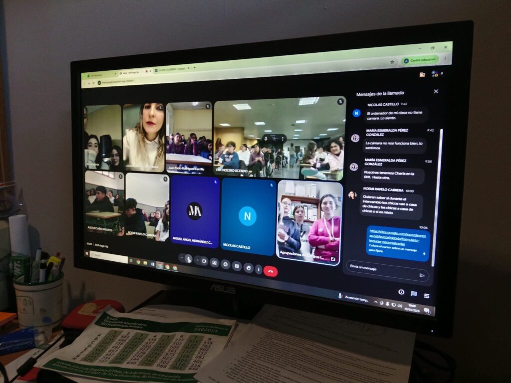 Esta reunión sirve de antesala para la recepción de los centros visitantes. Gracias a la claridad y el compromiso de nuestras alumnas, los equipos docentes colaboradores ya tienen una visión mucho más cercana de cómo trabajamos la voz, la lectura y el compromiso social en el IES López de Arenas.